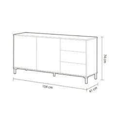 – Mueble aparador de 2 puertas con estantes interiores y 3 cajones en parte derecha y con patas en la parte inferior.