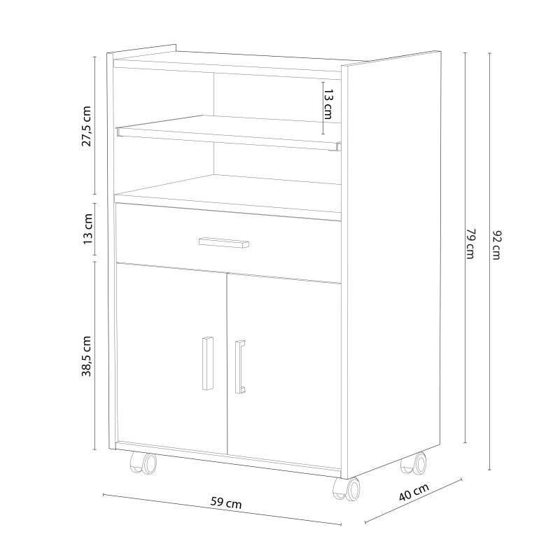 – Mueble auxiliar de cocina con ruedas con una bandeja extraible en la parte superior, un cajón en parte central y 2 puertas en parte inferior.