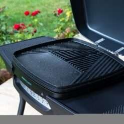 Barbacoa eléctrica con 2000 W de potencia, superficie de cocinado mixta con revestimiento antiadherente, tapa abatible, termostato regulable, bandeja recogegrasas, patas de acero y ruedas.