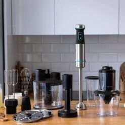 Batidora de mano de 1200 W, tecnología CrossBlades con cuchillas de 4 hojas con recubrimiento de titanio negro, pie XL extralargo, campana antisalpicaduras y selector de velocidad con función Turbo. Incluye vaso de 800 ml con tapa, varillas montaclaras, varillas batidoras, pasapuré, procesador de alimentos y espiralizador.