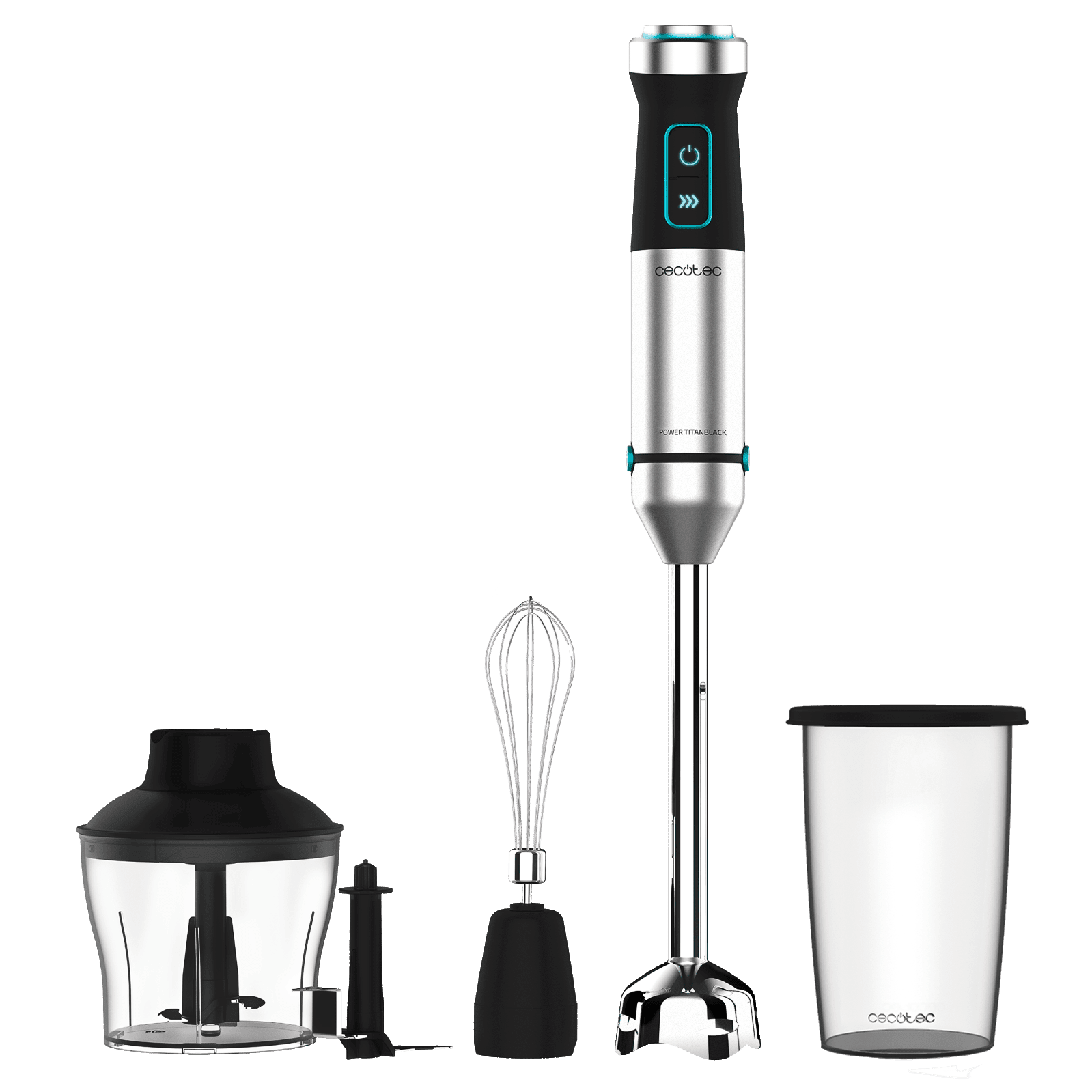 Batidora de mano de 1500 W, tecnología CrossBlades con cuchillas de 4 hojas con recubrimiento de titanio negro, pie XL extralargo, campana antisalpicaduras y selector de velocidad con función Turbo. Incluye vaso de 800 ml con tapa, varillas montaclaras y picadora con cuchilla pica hielo.