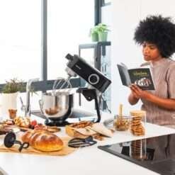Batidora amasadora de aluminio fundido con motor DC de 800 W, selector digital con 8 velocidades y bol de acero inoxidable de 5,2 L. Incluye un batidor de varillas, mezclador y brazo amasador.