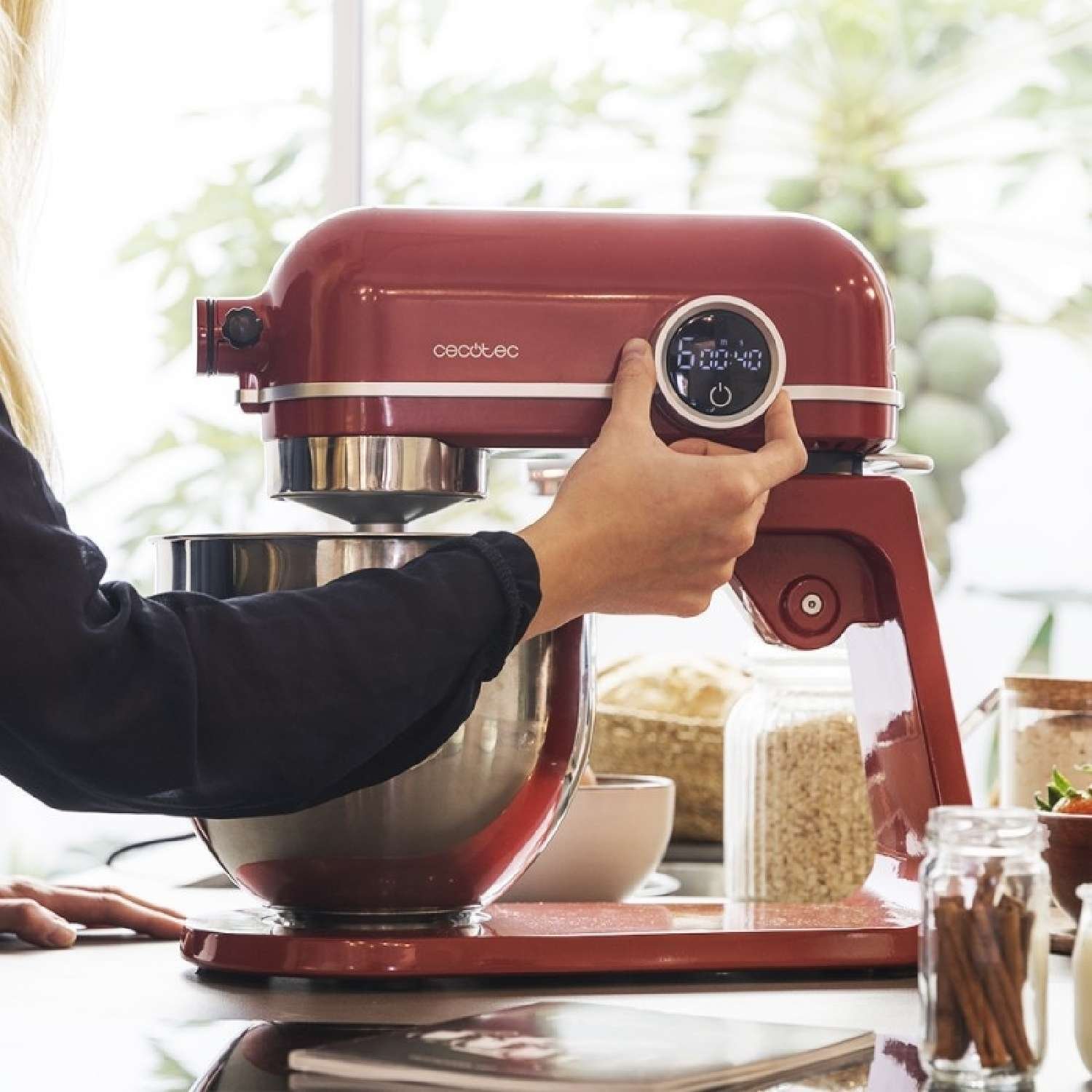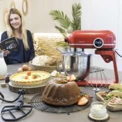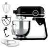 Batidora amasadora de aluminio fundido con motor DC de 800 W, selector digital con 8 velocidades y bol de acero inoxidable de 5,2 L. Incluye un batidor de varillas, mezclador y brazo amasador.