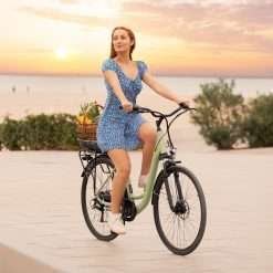 Bicicleta eléctrica de ciudad con 80 km de autonomía, 28″, suspensión delantera, cambio Shimano de 6 velocidades y doble disco de freno.