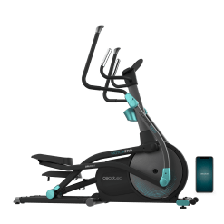 Bicicleta elíptica de resistencia magnética regulable a motor. 32 niveles de resistencia. APP. Pantalla LCD con soporte para dispositivos. Volante de inercia 10 kg. Pulsómetro. Zancada 43 cm. Rail doble.