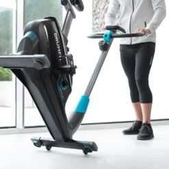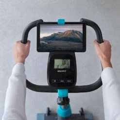 Bicicleta estática ideal para completar tu entrenamiento más exigente, con soporte de dispositivos para amenizar tus sesiones.