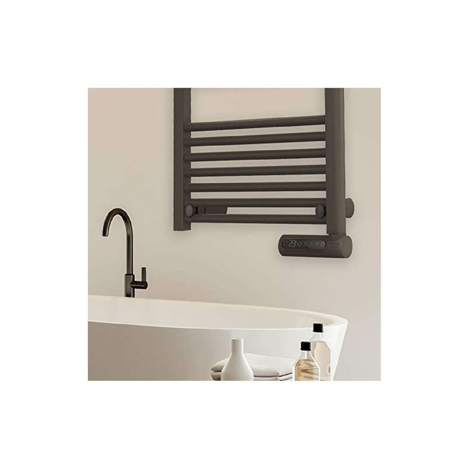 Toallero eléctrico de fluido con 750 W, pantalla LED, control táctil, programador semanal, 3 modos, temperatura seleccionable, y máxima seguridad con IP24.