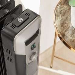 Radiador de aceite de 11 módulos y 2500 W con 3 niveles de potencia, cobertura de 25 m², recogecables, control sencillo, asa, ruedas y doble sistema de seguridad.