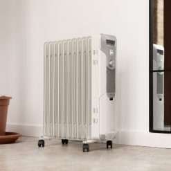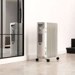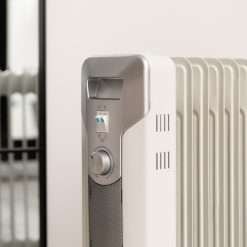 Radiador de aceite de 11 módulos y 2500 W con 3 niveles de potencia, cobertura de 25 m², recogecables, control sencillo, asa, ruedas y doble sistema de seguridad.