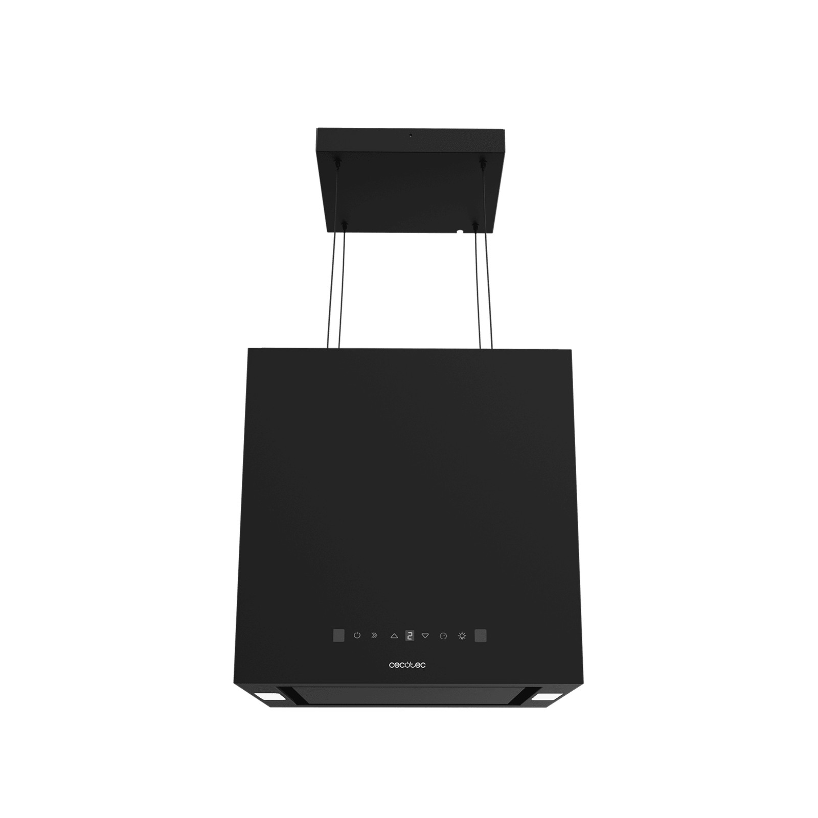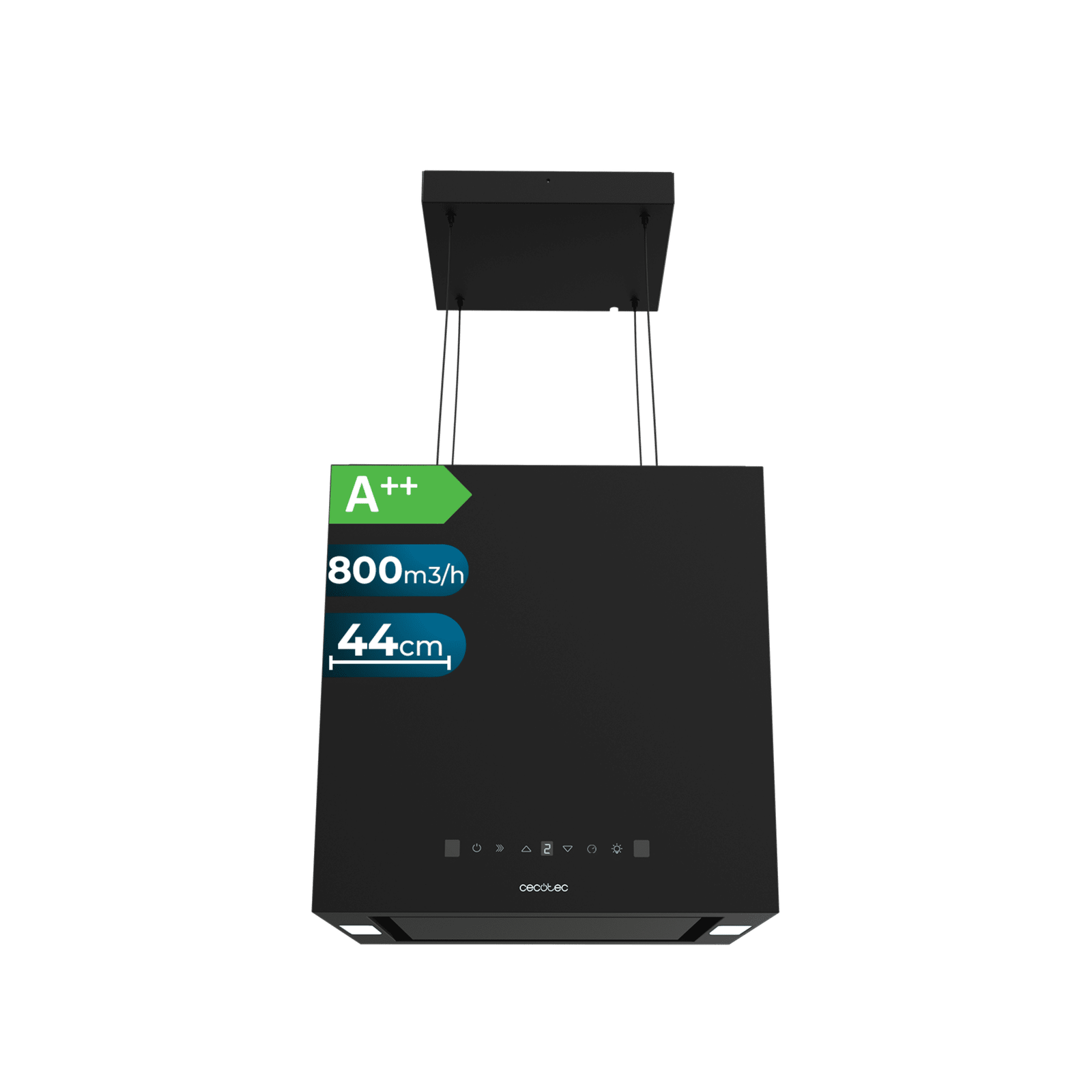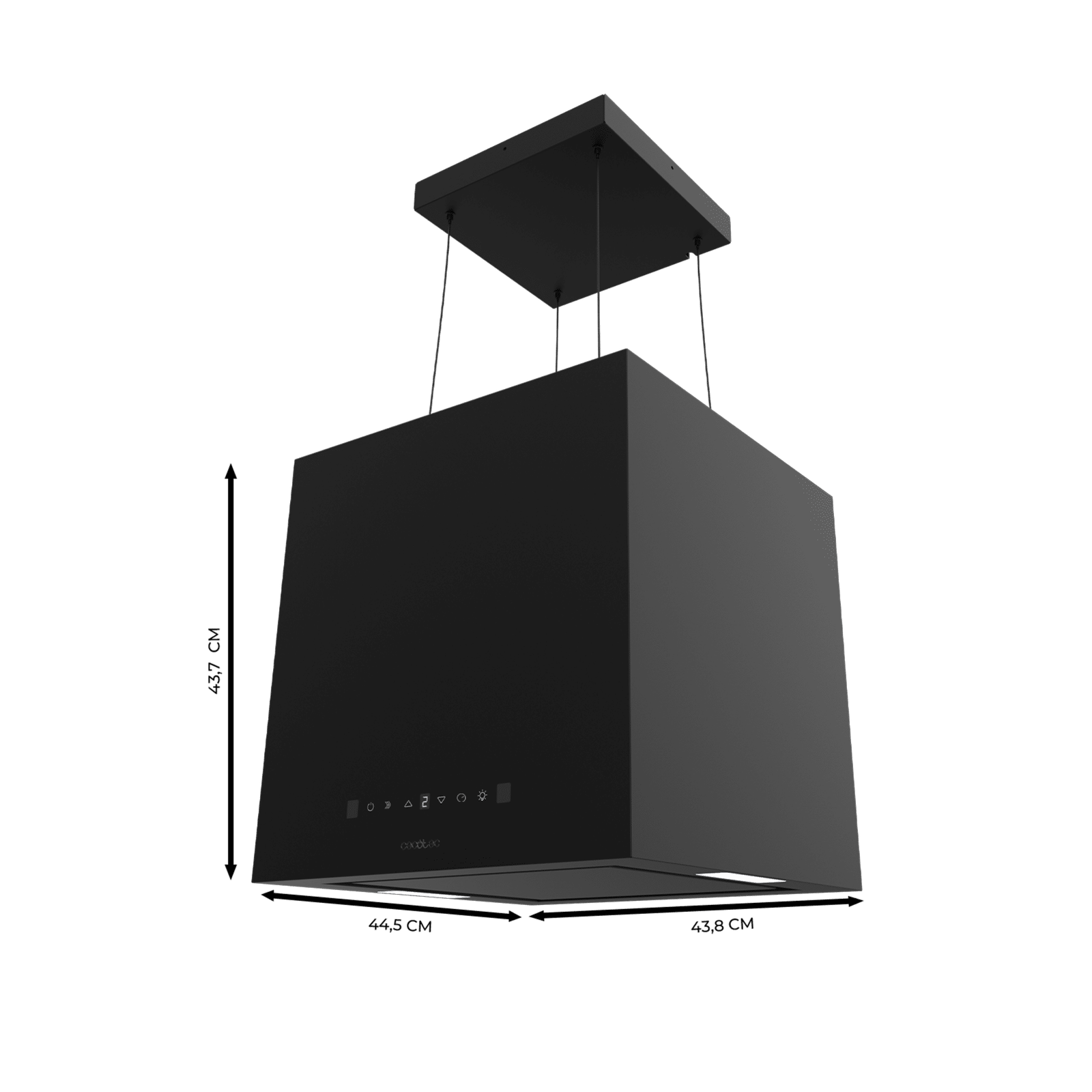 Campana colgante cuadrada Bolero Flux CCT 448000 Black A++ de 44cm de ancho, acabado negro, succión 800m3/h, Motor 220W, Clase A++, control táctil, 3 niveles de potencia, Booster, luz, filtro de carbono, Hand Movement Control y Smoke sensor.