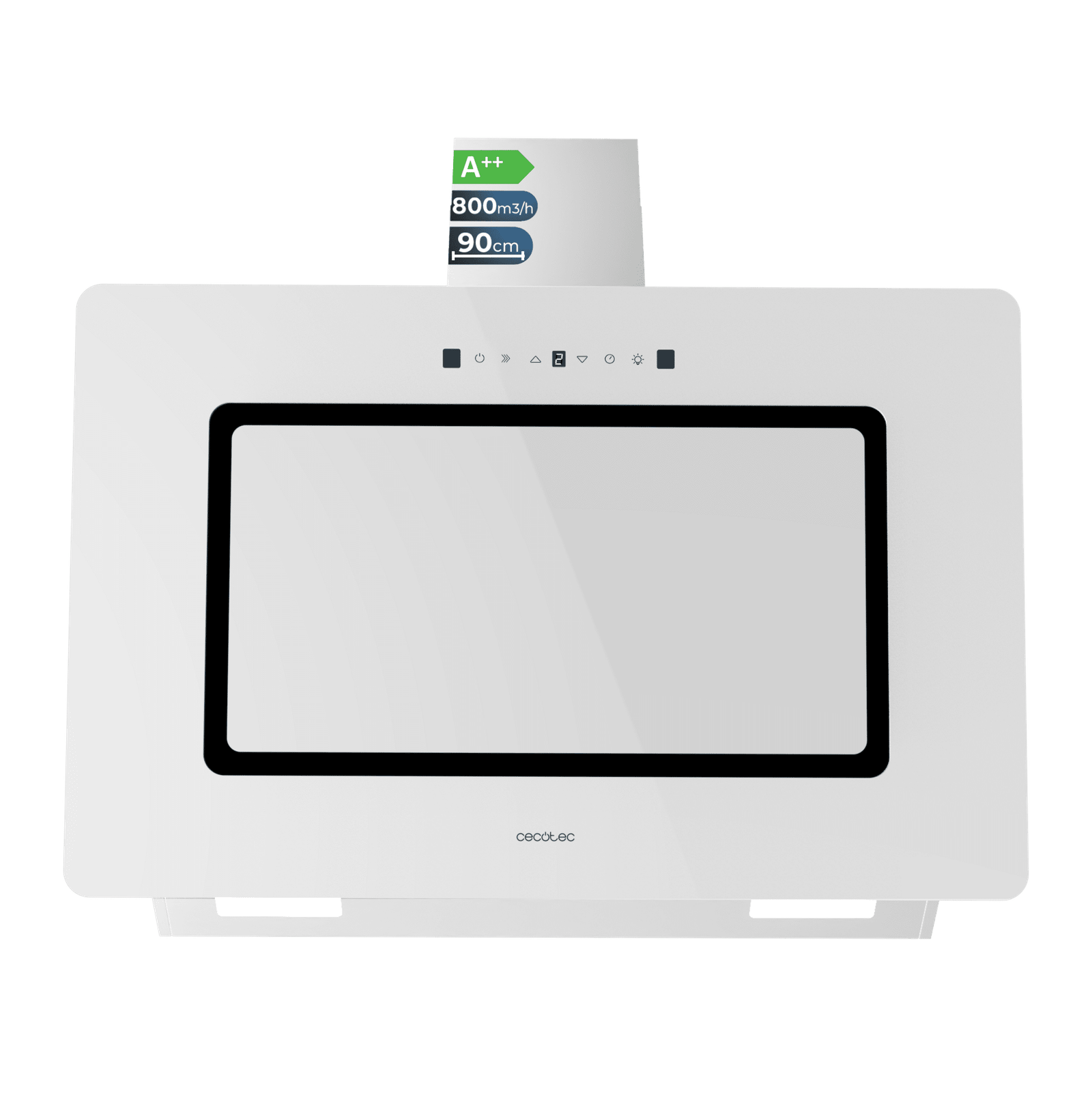 Campana decorativa Bolero Flux DT 908002 Glass White A++ de 90cm de ancho, acabado frontal vidrio blanco, chimenea inox, succión 800m3/h, Motor 220W, Clase A++, control táctil, 3 niveles de potencia, Booster, luz, filtro de carbono, Hand Movement Control y Smoke Sensor.