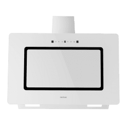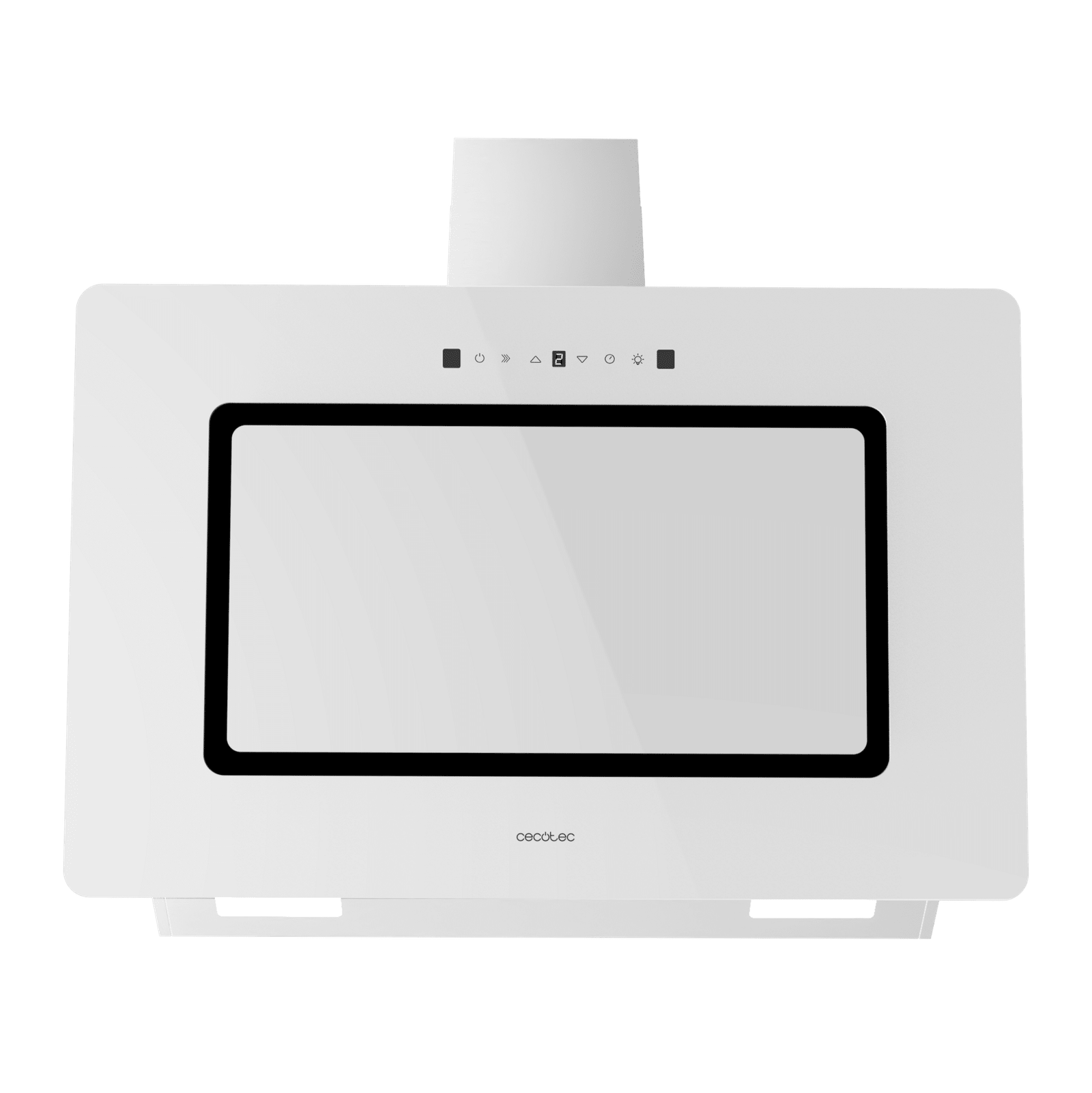 Acabado frontal de vidrio blanco: campana extractora con acabados frontales de vidrio blanco y chimenea inoxidable, para un diseño estilizado y elegante.