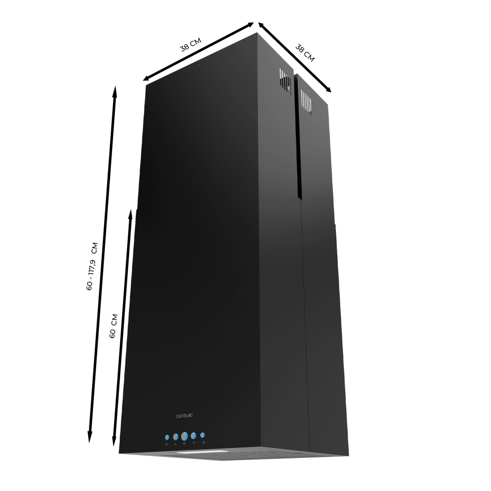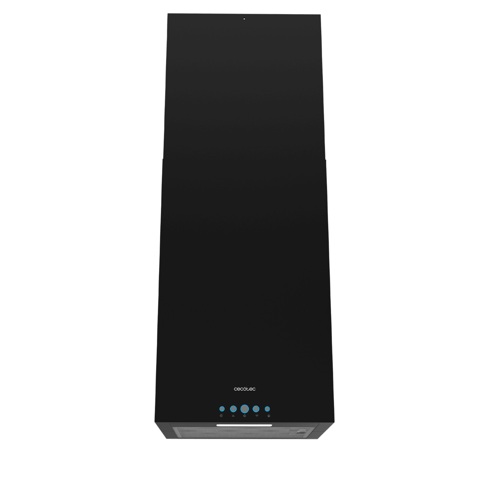 Campana isla cuadrada Bolero Flux ICT 388000 Black A++ de 38cm de ancho, acabado negro, succión 800m3/h, Motor 220W, Clase A++, control electrónico, 3 niveles de potencia, luz, filtro de carbono y Smoke sensor.