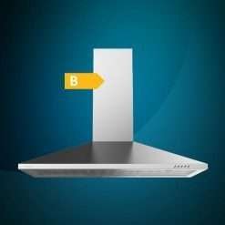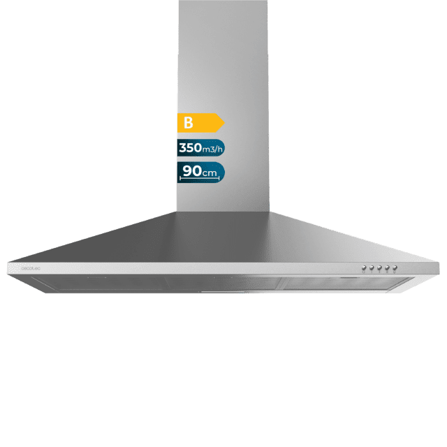 Campana piramidal Bolero Flux PM 903500 Inox B de 90cm de ancho, acabado inox, succión 350m3/h, Motor 65W, Clase B, control mecánico, 3 niveles de potencia, luz y filtro de carbono.