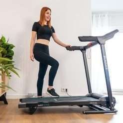 Cinta de correr plegable con potencia de 1100 W. De 1 a 12 Km/h. 12 programas predefinidos. Panel de control LED. Superficie de carrera de 110×40 cm. Plegable, con ruedas de transporte, sistema de seguridad magnético, pulsómetro, inclinación manual y soporte para dispositivos.