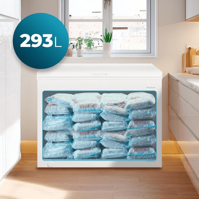- Gran Capacidad 293L Espacio de almacenamiento extraordinario ideal para amantes del batch cooking, familias numerosas y pequeños negocios que necesitan conservar grandes cantidades de alimentos congelados. Perfecto para preparar comidas semanales, almacenar productos de temporada y gestionar inventario comercial, optimizando tiempo, espacio y recursos con máxima eficiencia.
