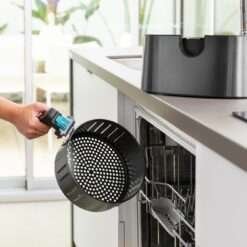 Freidora de diseño elegante y con acabados en acero inoxidable oscurecido, para una mayor resistencia y durabilidad.