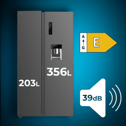 Frigorífico SBS con Capacidad 559 L. Multi Airflow. Total No Frost. Humidity/Crisper box, LED interior, Alarma de puerta, Control de temperatura, Inverter Plus. Modo eco, Modo vacaciones, fast freezing y cooling, Display en la puerta. Color Dark inox Clasifición energética E. Ancho 91,2 /Fondo 70,4 /Alto 177 cm