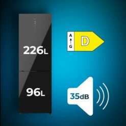 Combi con Capacidad 322 L. Multi Airflow. Total No Frost. Humidity/Crisper box, LED interior, Puerta reversible, Alarma de puerta, Control de temperatura, Inverter Plus. Modo eco, Modo vacaciones, fast freezing y cooling, Display en la puerta. Color cristal negro Clasifición energética D. Ancho 59 /Fondo 63,5 /Alto 185,5cm