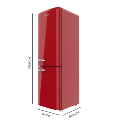 Frigorífico combi retro rojo, 176,5cm alto y 54cm ancho, capacidad 231L, Total No Frost y clase E y con sistema Multi Air Flow. Además, cuenta con el modo Fast Cooling.