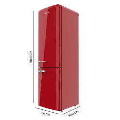 Frigorífico combi retro, 186,5cm alto y 54 cm ancho, capacidad 250L, Total No Frost y clase E y con sistema Multi Air Flow. Además, cuenta con el modo Fast Cooling.
