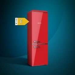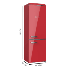 Frigorífico retro combi Origin Red con capacidad de 300L, clase E, LED interior, tirador cromado, bandejas de cristal y abridor de botellines. Ancho 55,9 /Fondo 62,8 /Alto 192cm