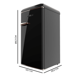 Mini frigorífico retro negro de 89 cm de alto y 49 cm de ancho con capacidad de 95L, clase energética E, Icebox y tirador cromado.