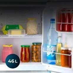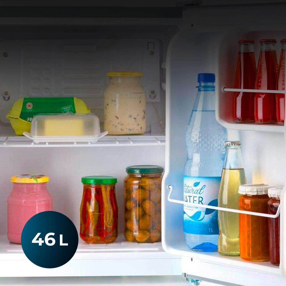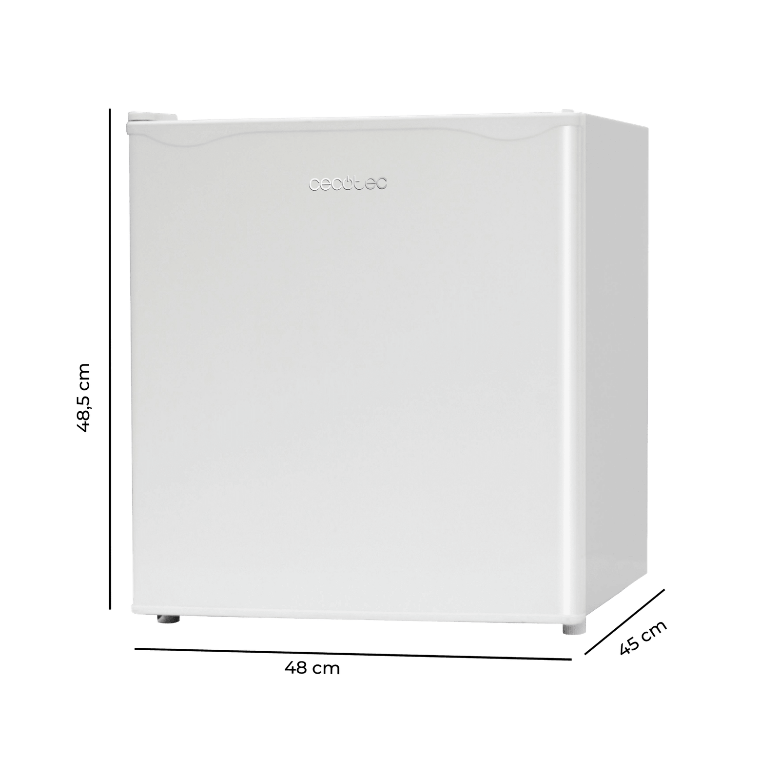 Mini Frigorífico blanco, capacidad de 46 Litros, 48 cm de ancho y 48,7 cm de alto, puerta reversible, funcionamiento cíclico, clase energética E