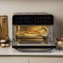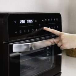 Horno freidora de aire caliente, con convección, 25 litros de capacidad, 1800 W de potencia y con pantalla táctil. Incluye cesta para freír, bandeja para hornear, rejilla para horno, bandeja recogegrasas desmontable.