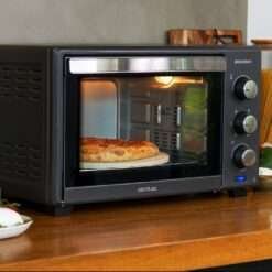 Horno de sobremesa de convección eléctrico multifunción. Con rustidor. Cocina por convección. Equipado con luz interior. 30 litros de capacidad y puerta con doble cristal. 1600 W. Ideal para pizzas.