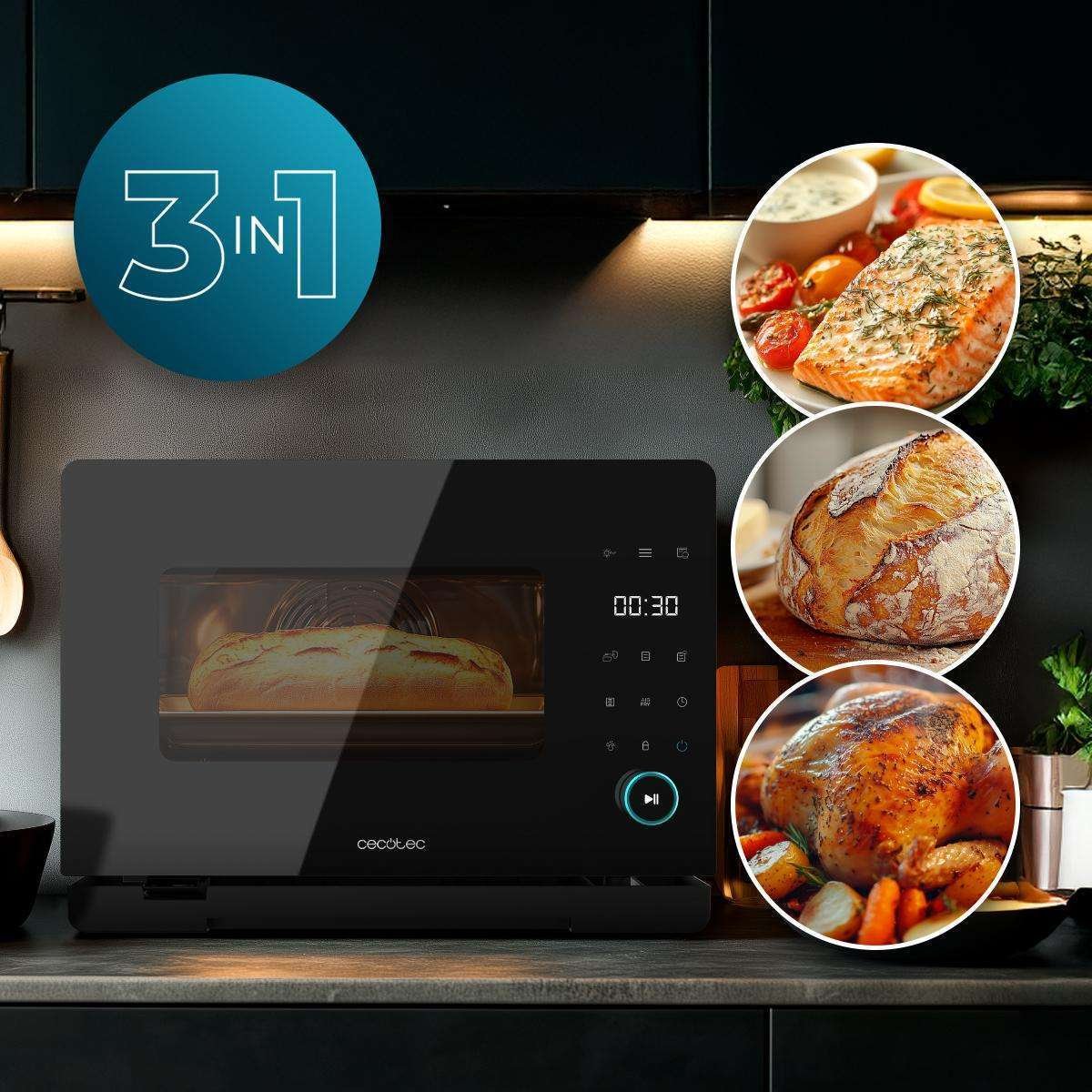 Horno 3 en 1: explora una amplia gama de técnicas culinarias en un solo electrodoméstico con sus funciones de vapor, convección y freidora de aire.