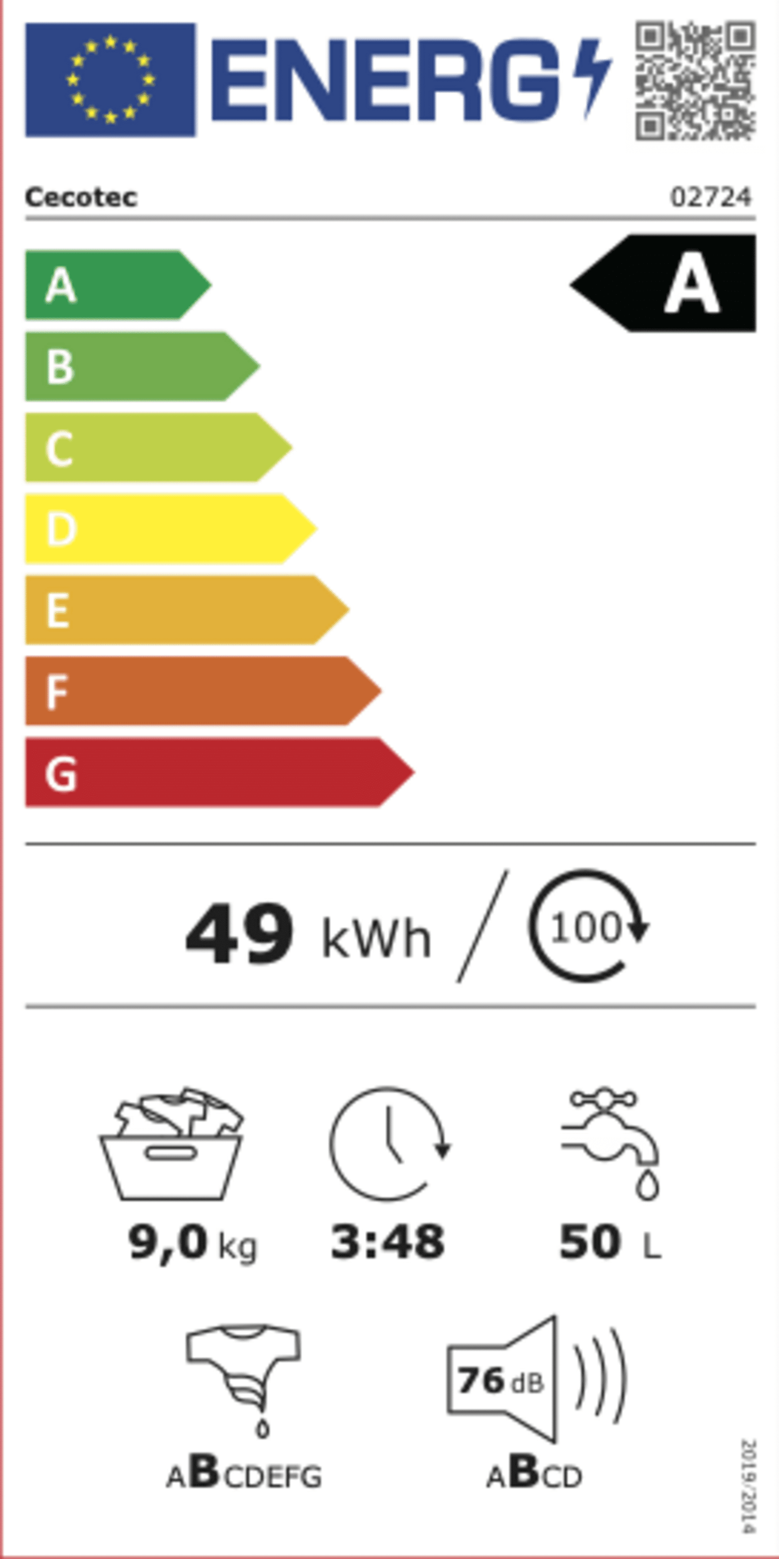 Clase A – Máxima Eficiencia Energética: Cumple con la normativa de etiquetado energético para ofrecer la máxima eficiencia energética, asegurando un lavado efectivo y un ahorro significativo.