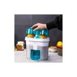 Exprimidor de 90 W con doble cabezal y cortador incorporado para exprimir y cortar dos mitades de naranja a la vez.
