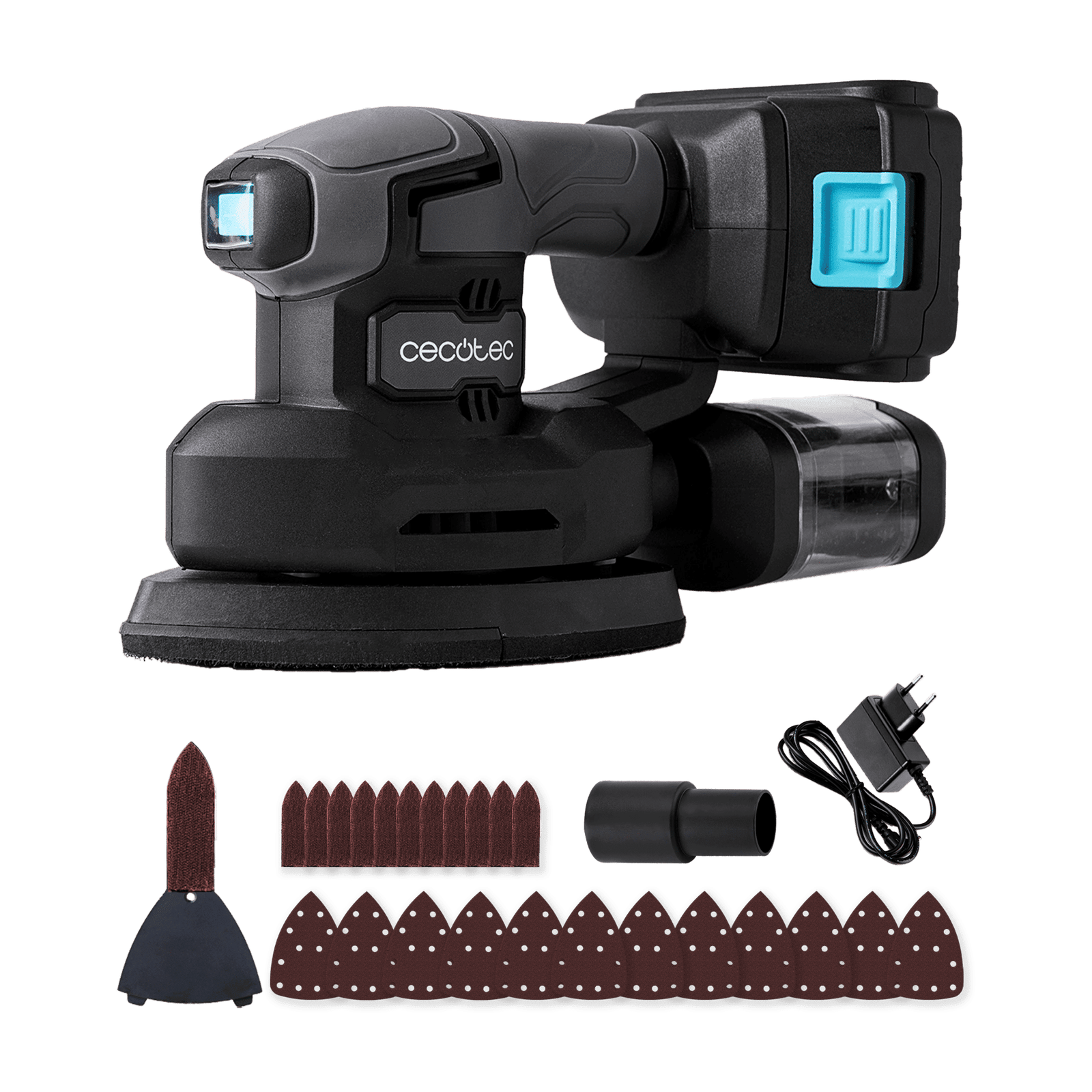 Lijadora, depósito de polvo, accesorio de detalles, batería, cargador, 12 recambios de papel completos, conector de aspirador, manual de instrucciones.