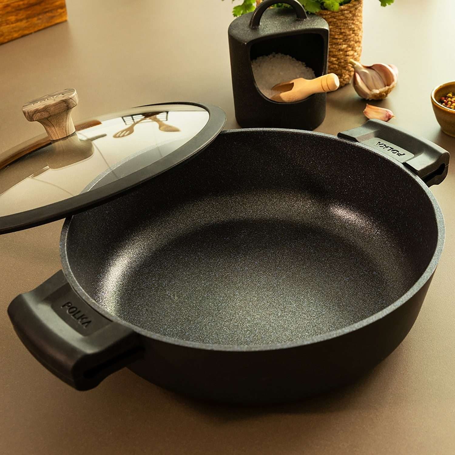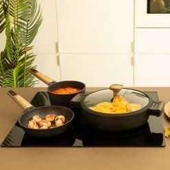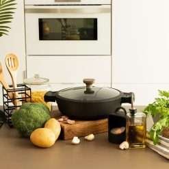 Olla baja de 28 cm de aluminio FUNDIDO de alta calidad, cuenta con 6 capas y revestimiento de máxima antiadherencia Teflon™ Nonstick Coating, libre de PFOA, con fondo difusor de calor Full Induction, aptas para lavavajillas y para todo tipo de cocinas incluida la de inducción.