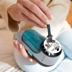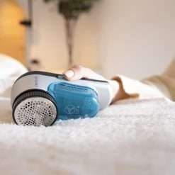 Quitapelusas con batería recargable de hasta 45 minutos de autonomía, sistema de seguridad, tres cuchillas ultra afiladas, que llegan hasta las 8800 revoluciones por minuto. Contiene depósito de hilos.