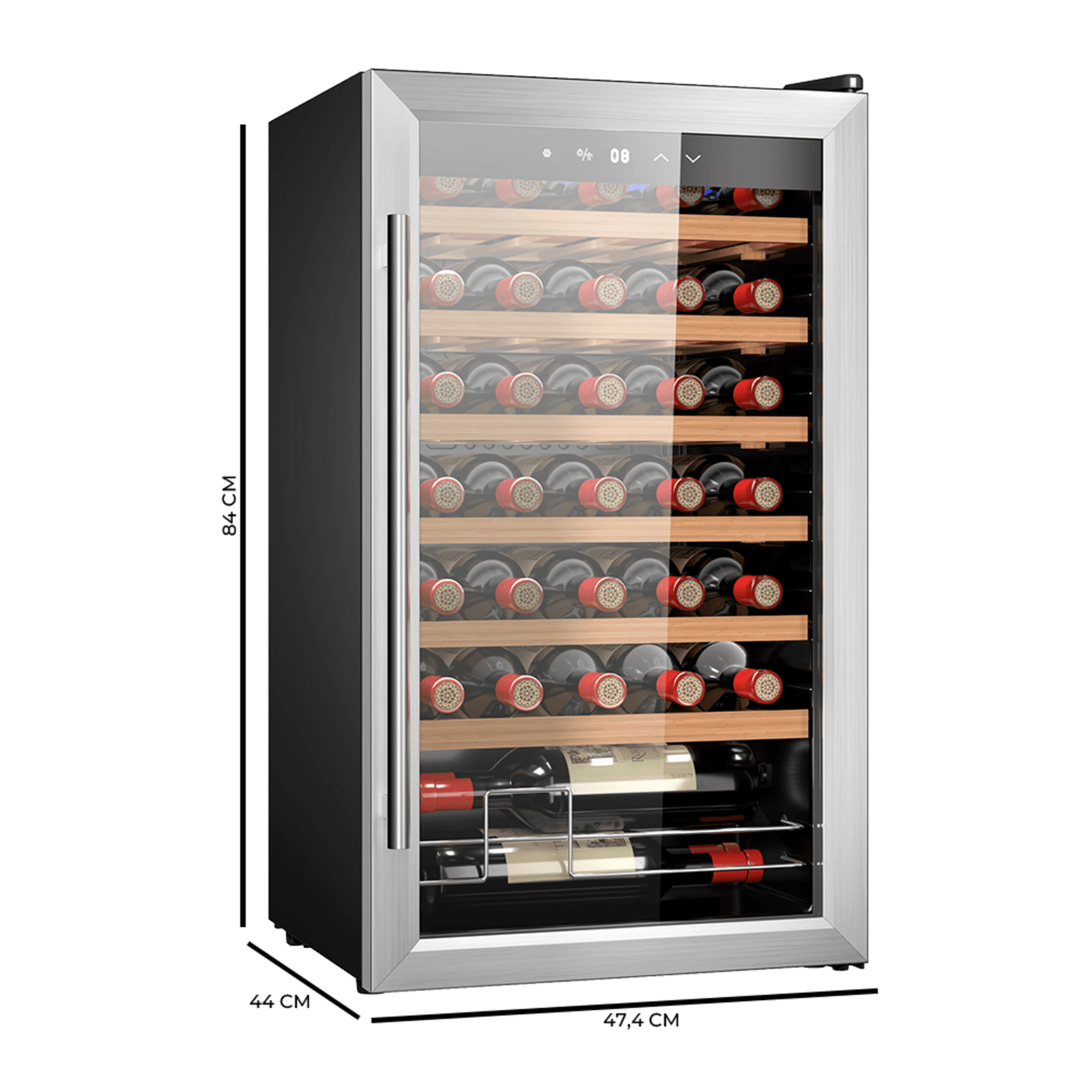 Vinoteca de 34 botellas de capacidad con sistema compresor de enfriamiento que garantiza un alto rendimiento. Temperatura regulable y luz LED interior. Ancho 48,2 /Fondo 47 /Alto 80cm
