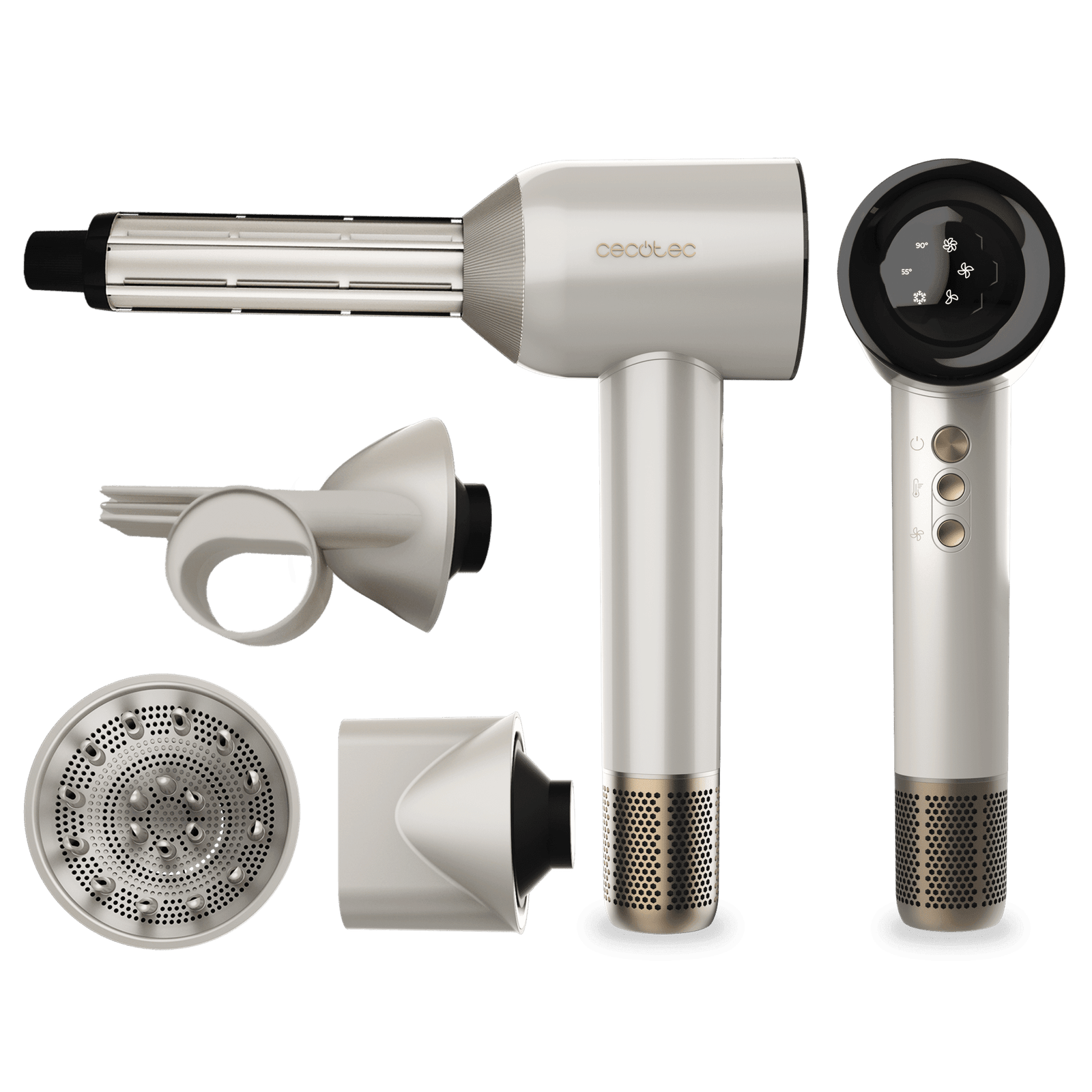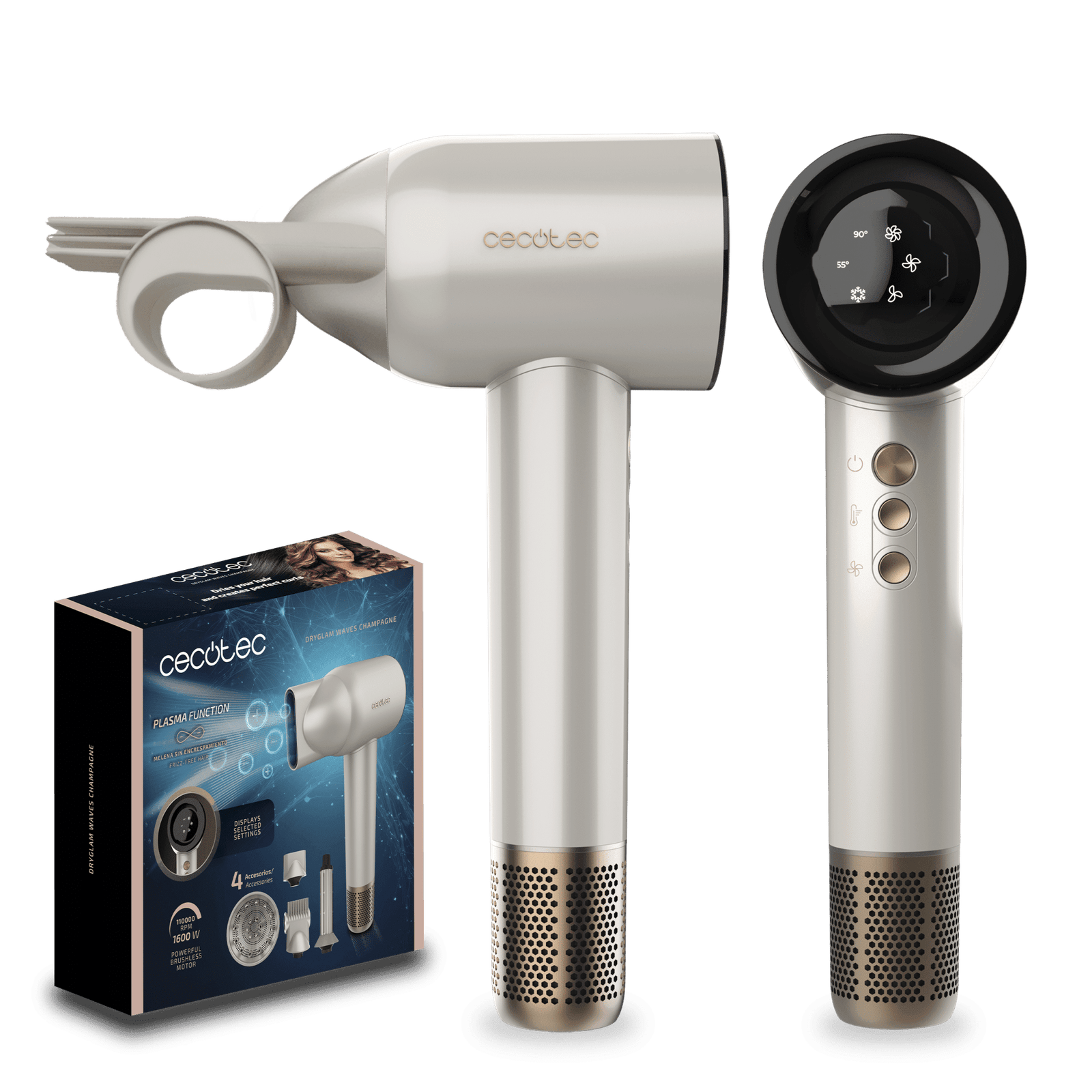 Secador de pelo con motor Brushless y Tecnología de Plasma Revolucionaria, Motor de 1600W y 110000 RPM, 4en1 cabezales con Efecto Coanda, Pantalla Digital, Control Inteligente del Calor, Función de Memoria y Motor Silencioso