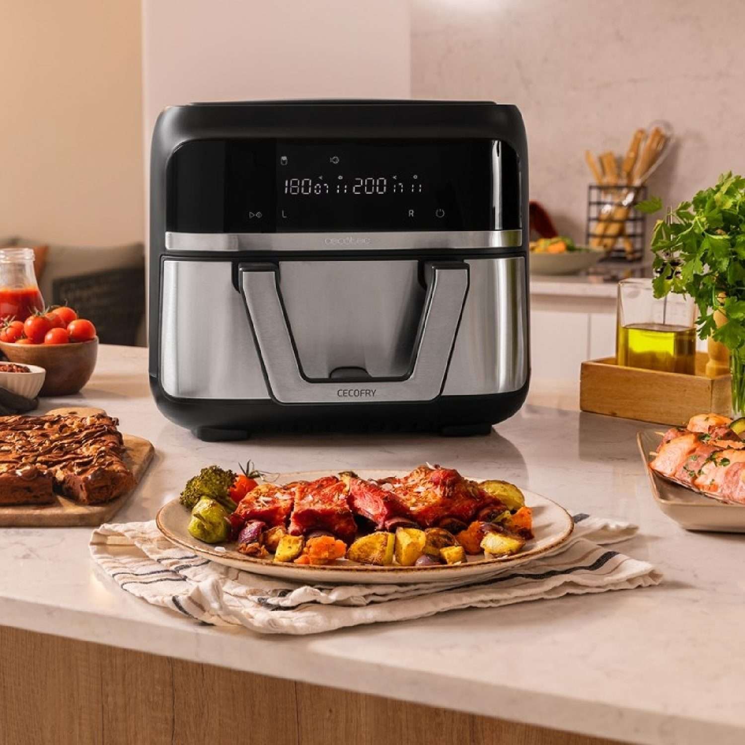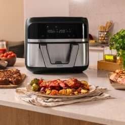 Freidora dietética digital y compacta sin aceite de 9 L de capacidad, tecnología PerfectCook y pared divisoria móvil para optar entre dos cestillos con temperatura dual o convertirse en una sola cubeta.