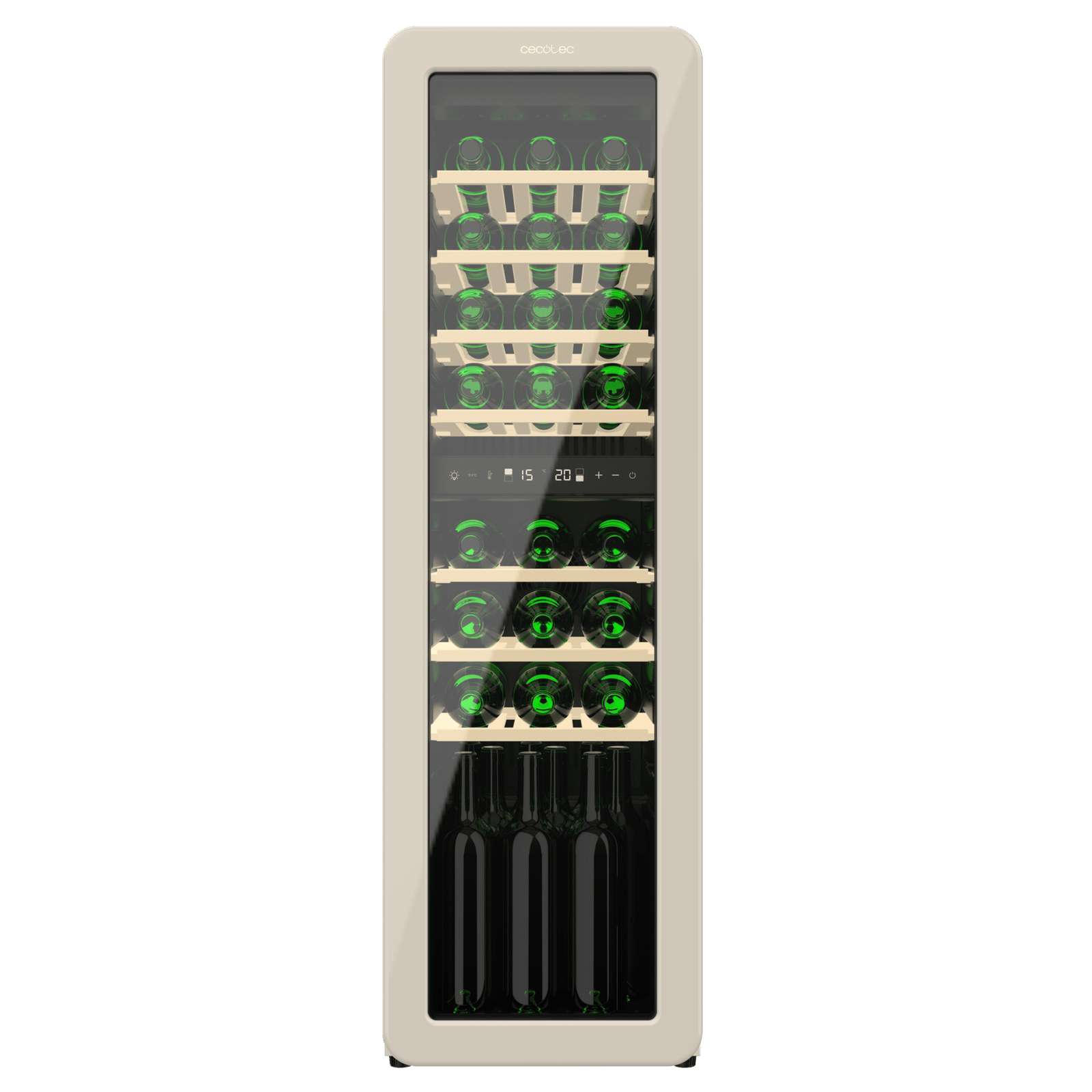 Vinoteca diseño retro color beige doble zona, Capacidad 30 botellas, Temperatura 5 a 20ºC, Estantes madera, Control electrónico, Display LED, NoFrost, Luz interior, Ventilación interna, Alto 120,5cm, Ancho 36,6cm