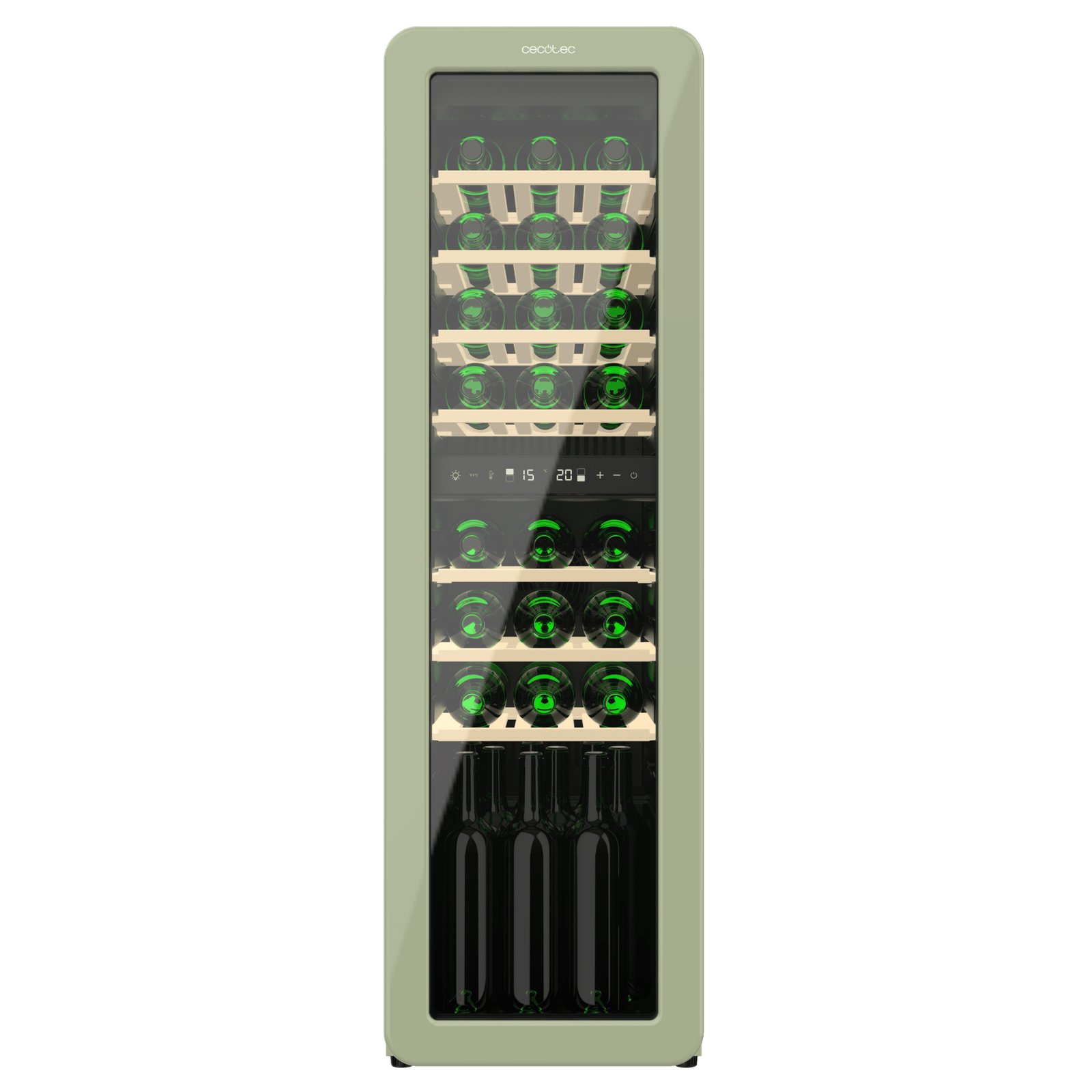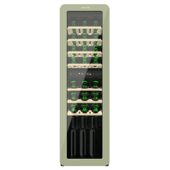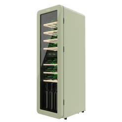 Vinoteca diseño retro color verde doble zona, Capacidad 30 botellas, Temperatura 5 a 20ºC, Estantes madera, Control electrónico, Display LED, NoFrost, Luz interior, Ventilación interna, Alto 120,5cm, Ancho 36,6cm