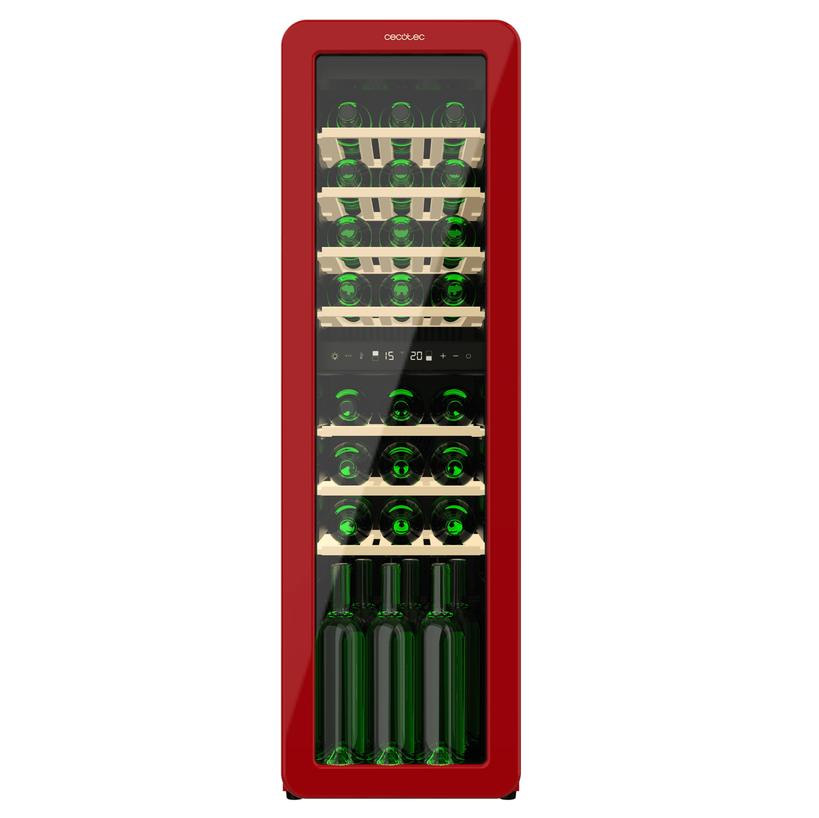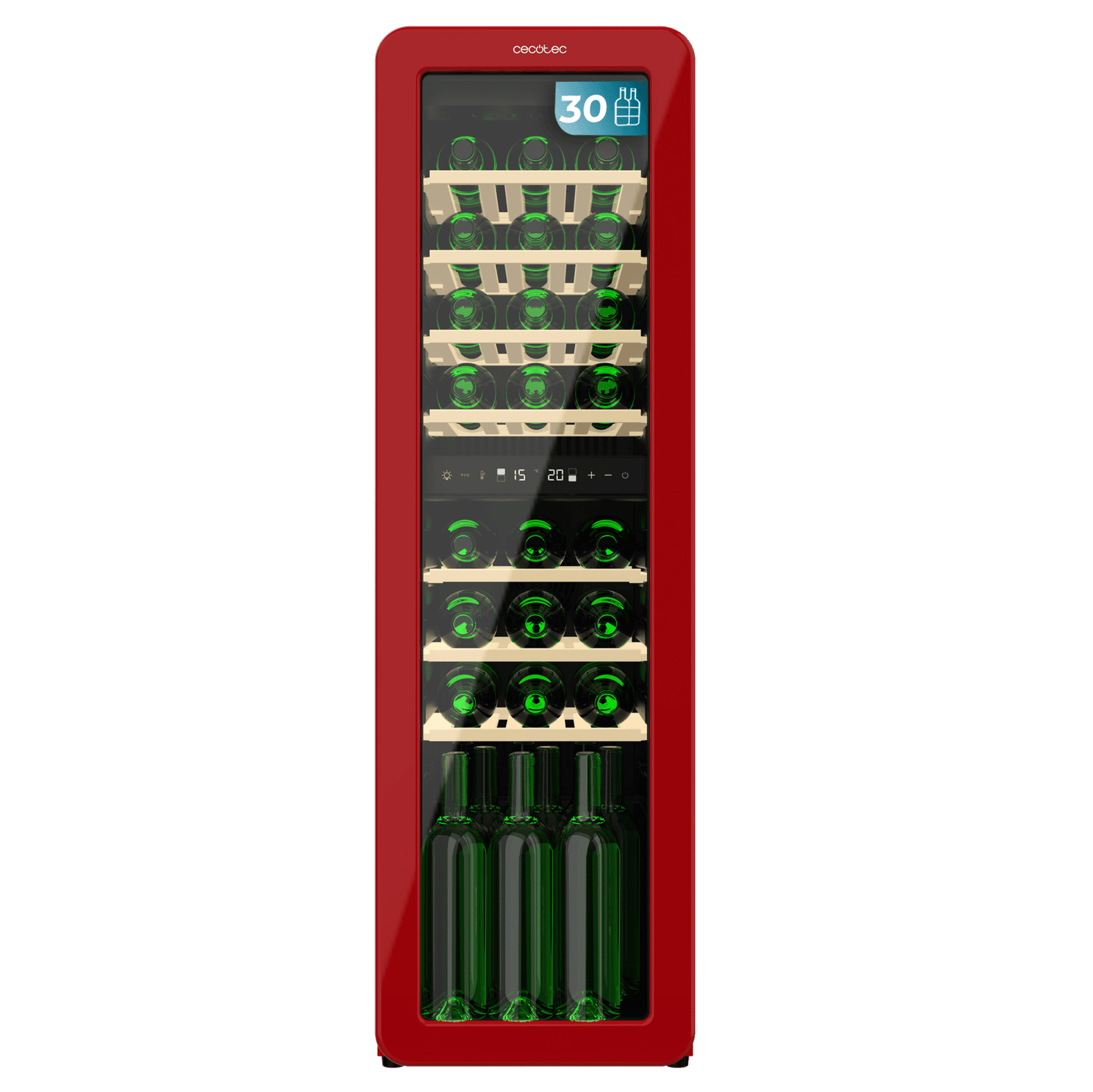 Vinoteca diseño retro color rojo doble zona, Capacidad 30 botellas, Temperatura 5 a 20ºC, Estantes madera, Control electrónico, Display LED, NoFrost, Luz interior, Ventilación interna, Alto 120,5cm, Ancho 36,6cm