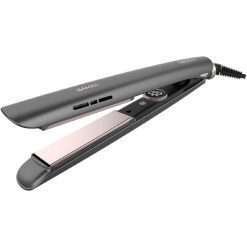 Plancha de pelo de cerámica y turmalina con doble generador de iones y pantalla LED con ajuste de temperatura.