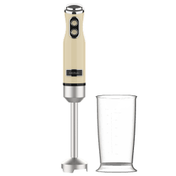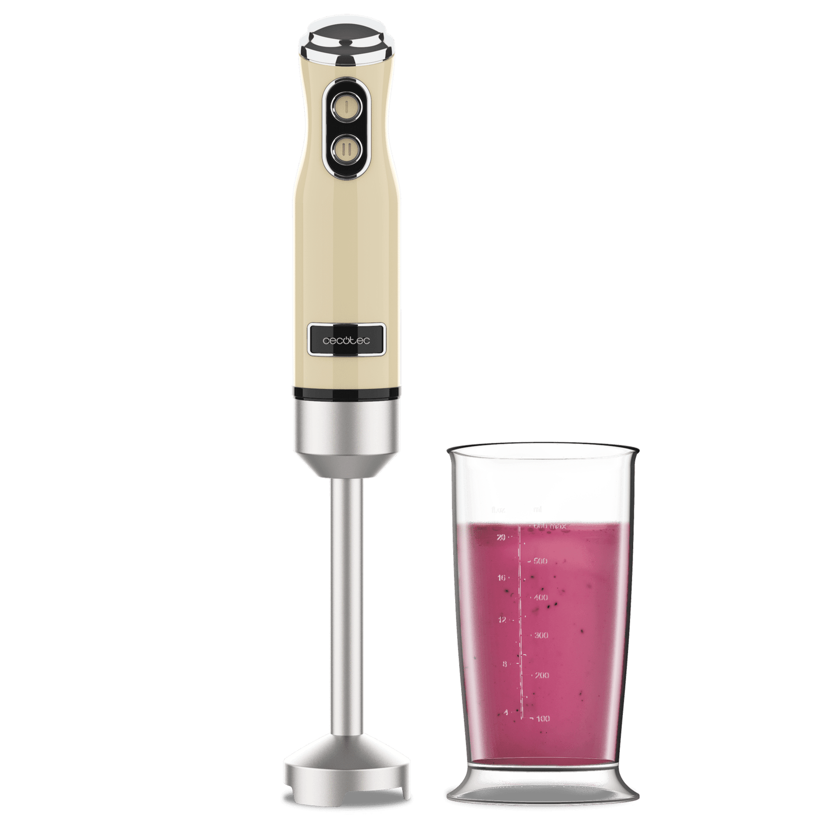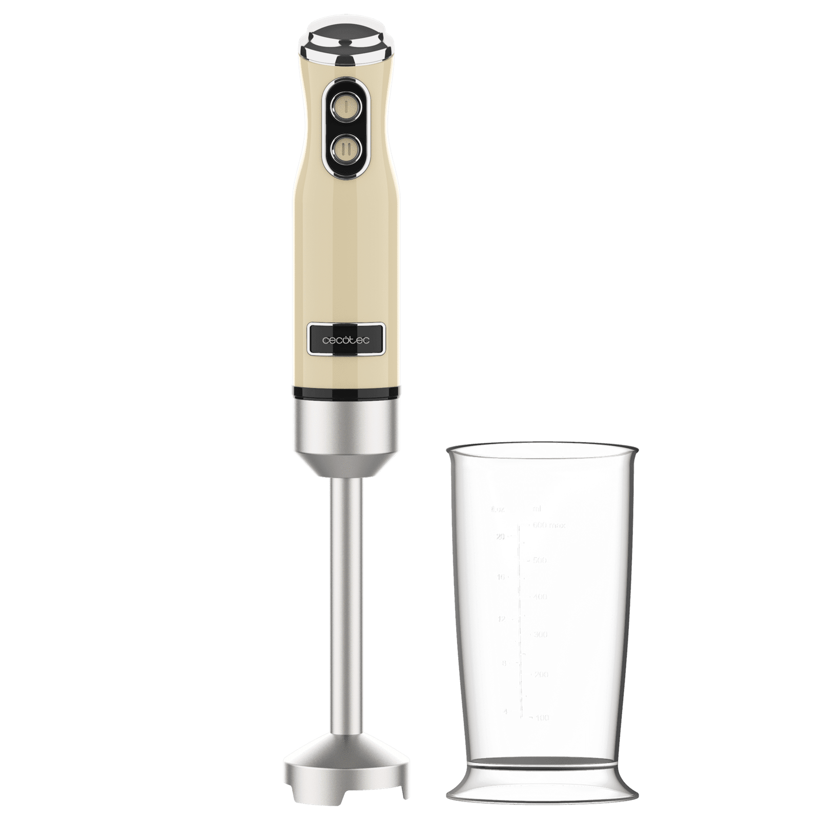 Batidora de mano retro con 1200 W de potencia máxima, cuchilla de 4 hojas con recubrimiento de titanio negro y velocidad ajustable.