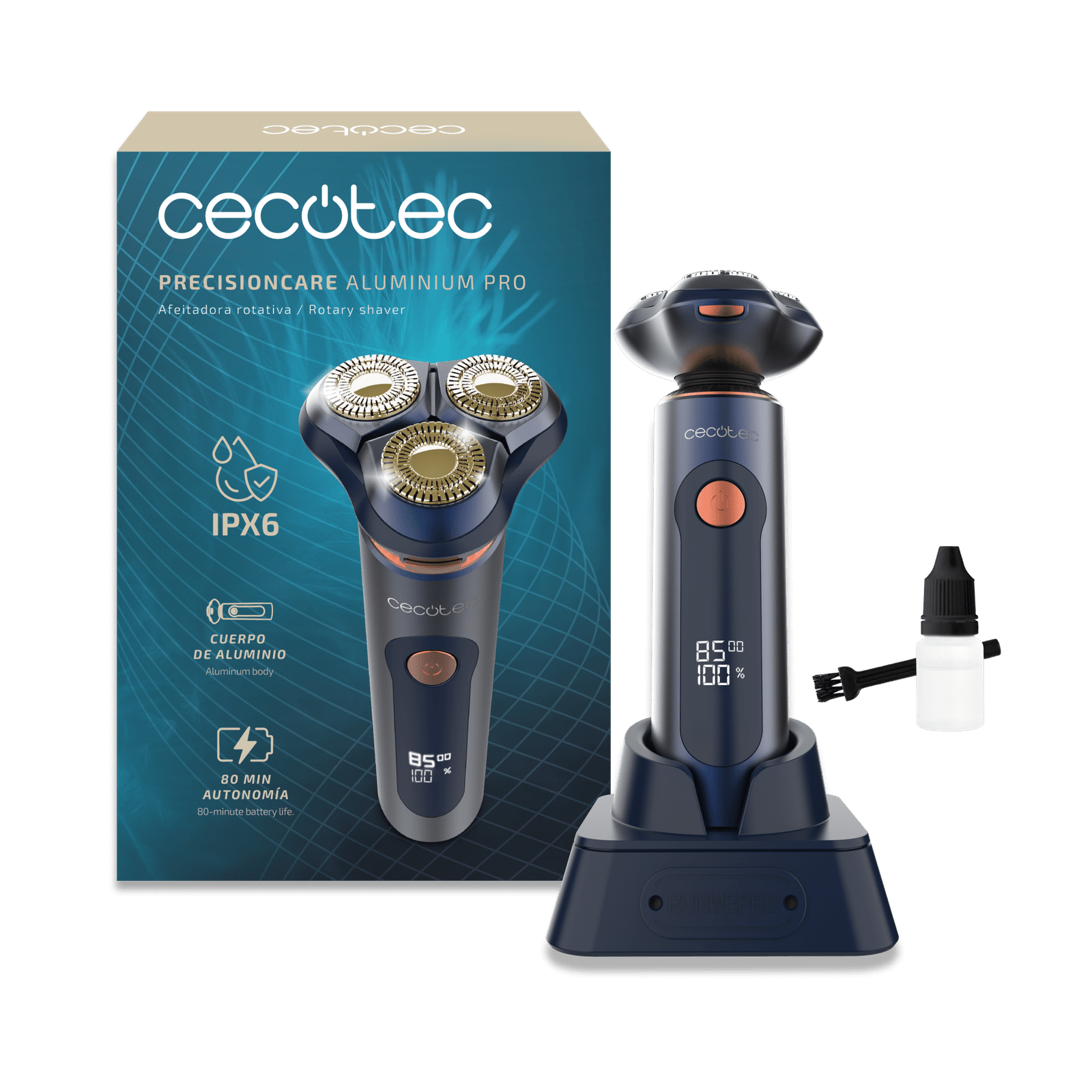 PrecisionCare Aluminium Pro: Afeitadora Rotativa, 80 mins de Autonomía, Pantalla, Cuchillas de Titanio, Base de carga