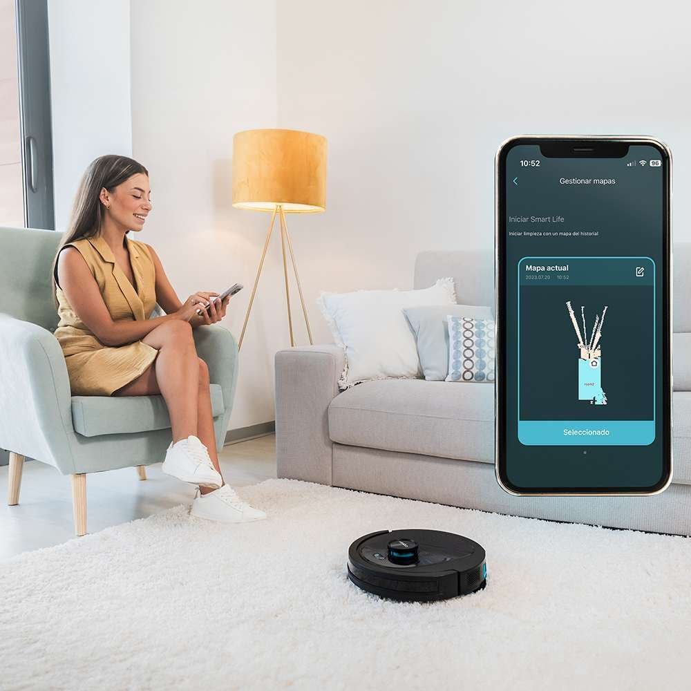 – Control mediante APP CECOTEC, con la que podrás seleccionar los diferentes modos, la programación, el nivel de succión o el nivel de fregado, además de observar el historial de limpieza. Es compatible con asistentes virtuales.