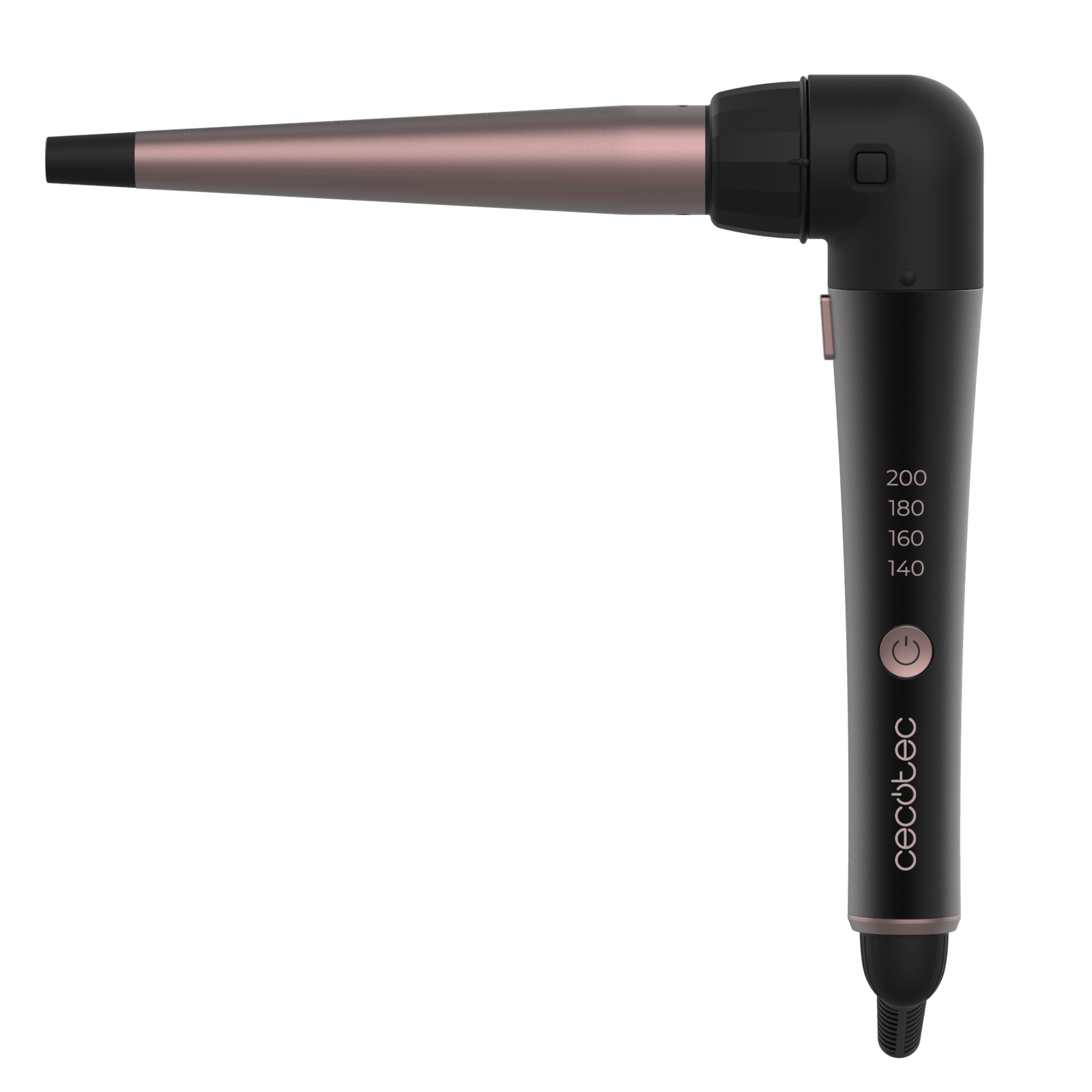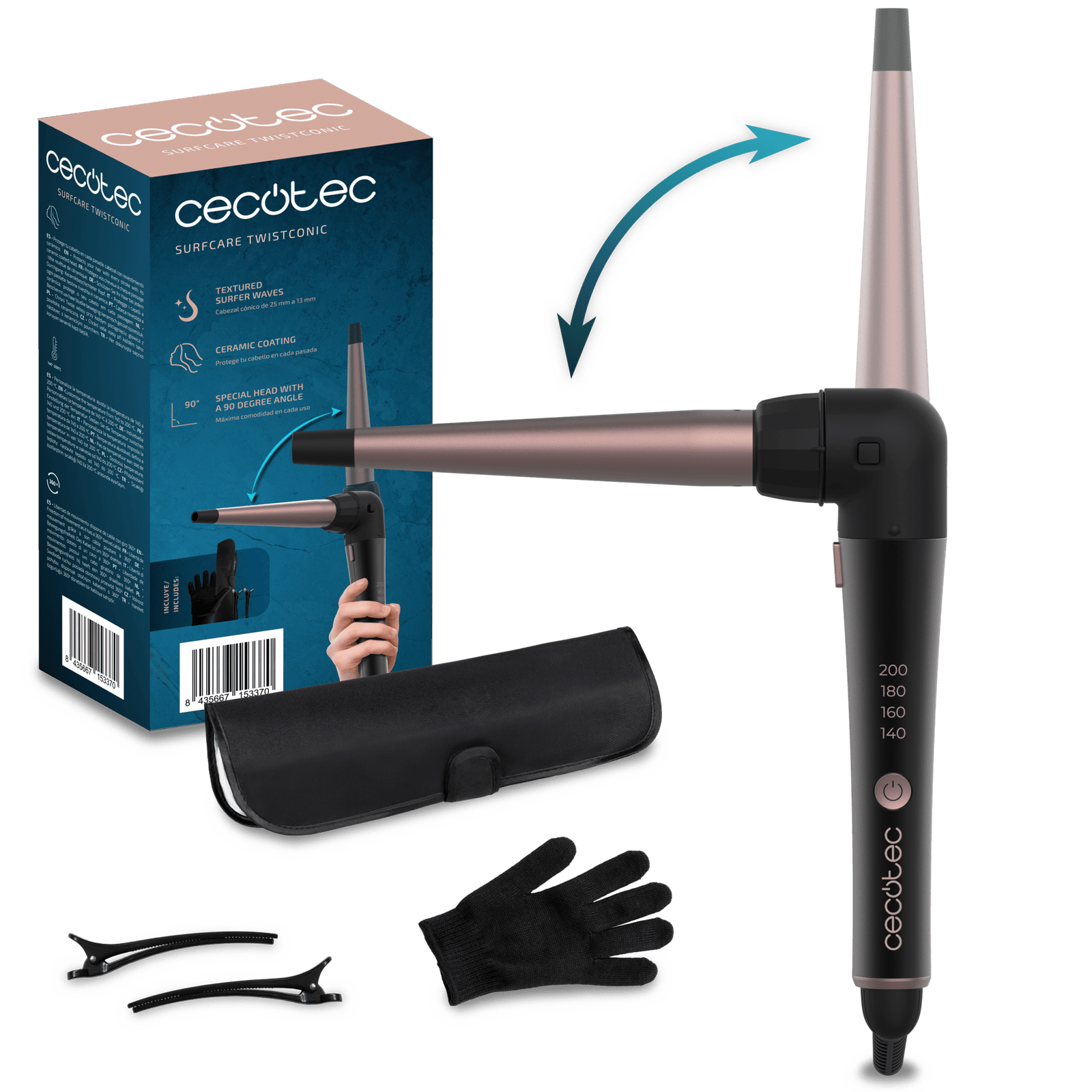 Rizador de pelo cónico, con un codo de 90 grados que asegura mayor comodidad de uso y con guante térmico, estuche y 2 clips.