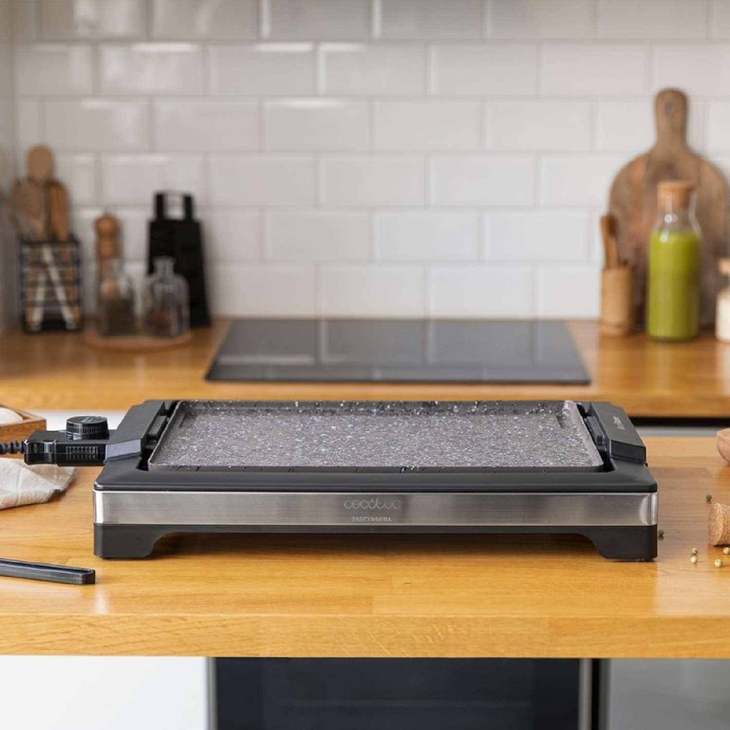 Plancha de asar eléctrica de 2000 W, con estructura de diseño y con acabados en acero inoxidable. Termostato regulable y placa de asar antiadherente con superficie de plancha, revestimiento RockStone y apta para lavavajillas.