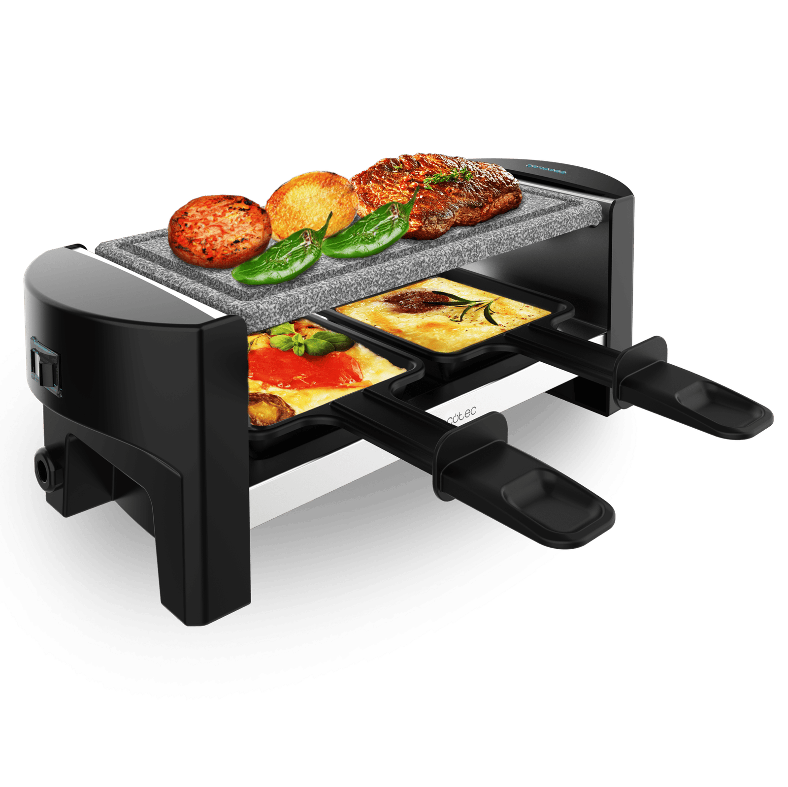 Raclette Cheese&Grill 3200 Pocket AllStone Máquina de raclette para 2 personas con grill de 320 W. Con estructura de diseño con acabados en acero inoxidable, botón de encendido y apagado, y placa de asar de piedra. Incluye 2 sartenes pequeñas antiadherentes y 1 espátula de madera.