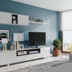 – Conjunto para salón compuesto de un mueble de televisión con 3 puertas, un módulo superior de 2 puertas y un estante de colgar.